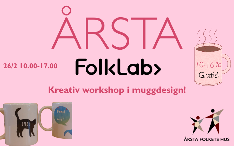 Snart är det dags för vårt dagsläger Folklab! Den 26/2 10.00-17.00 hänger vi i Foajén och lär oss att designa egna porslinsmuggar med vinyltryck! Alla mellan 10-16 år är välkomna, det är helt gratis och vi bjuder på fika. Anmäl dig i formuläret här eller skriv till selma@arstafolketshus.org. För att så många som möjligt ska få göra en mugg har vi delat upp dagen i 6 perioder på 1 timme, önska gärna en som passar dig eller ditt barn bäst!